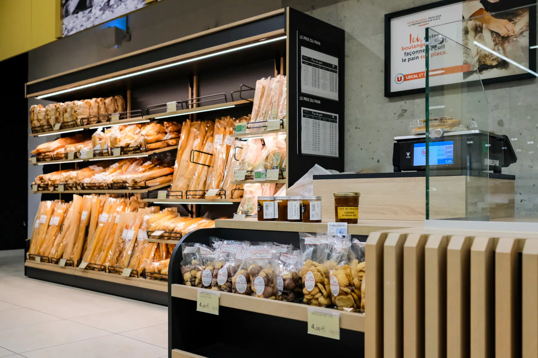 L’ensemble de l’espace dédié à la boulangerie présente une harmonie dans ses finitions, assurant une cohérence globale dans le magasin.