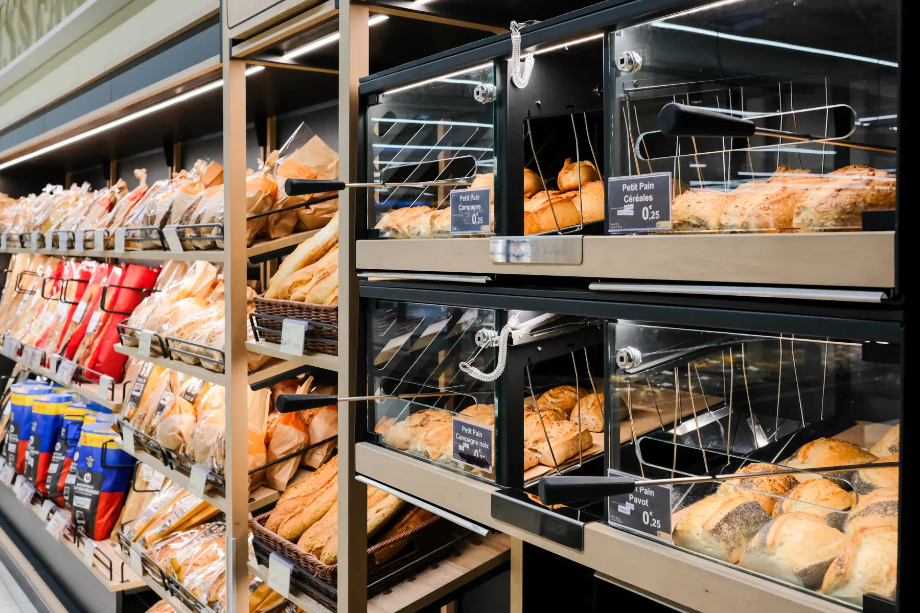 Dans la lignée du comptoir de la boulangerie traditionnelle, le rayon de boulangerie en libre-service comprend des meubles hauts avec étagères, des modules pour les produits en vrac et des tables de masse.