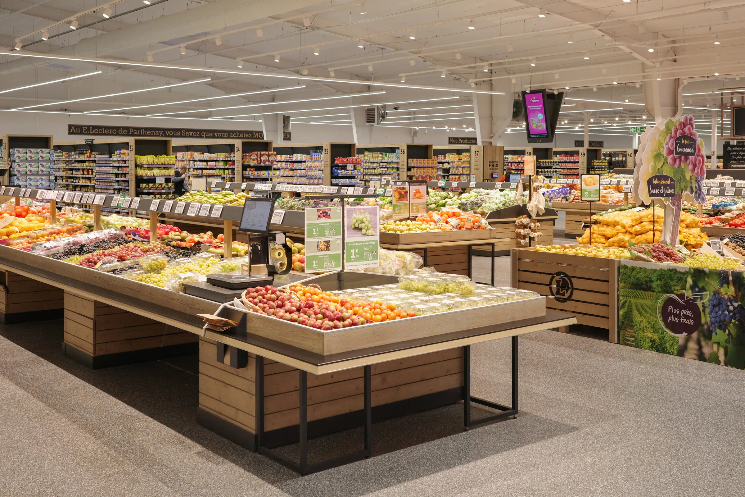 Leclerc Parthenay nous a confié l’aménagement de son espace fruits et légumes. Ce choix illustre une volonté commune : allier qualité, durabilité et proximité pour offrir aux clients une expérience d’achat optimale.