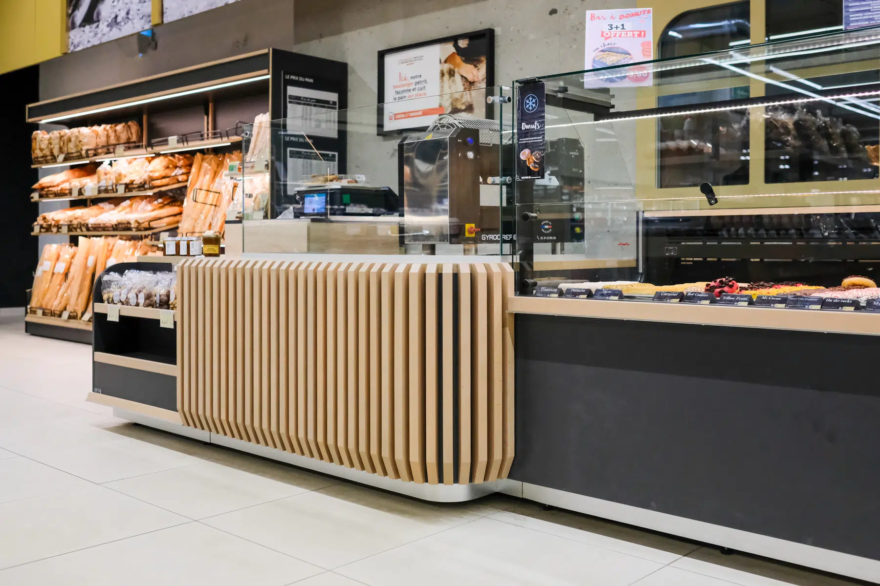 Son design soigné se distingue notamment par une façade décorative réalisée à partir de montants verticaux en chêne massif. Ce choix de matériau noble apporte une touche chaleureuse et authentique, en parfaite harmonie avec l’univers artisanal de la boulangerie. En plus de son esthétique naturelle et élégante, cet habillage en bois massif renforce la qualité perçue de l’espace et crée une atmosphère accueillante.